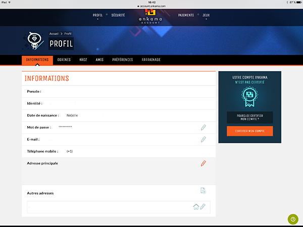 Il existe un moyen très simple de sécuriser son compte. Cette étape peut être faite lors de la création du compte ou plus tard en retournant sur le site d'Ankama et en ouvrant la session avec le nom de votre compte et votre mot de passe. Je poursuis avec la méthode utilisée à partir du jeu sur tablette. Sur internet, vous retrouvrez facilement la section pour sécuriser votre compte.