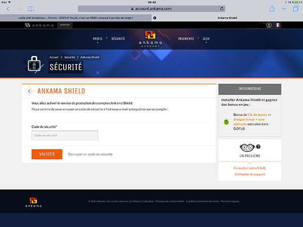 Taper le code de sécurité que vous recevrez dans votre courriel puis valider. Vous pourrez ensuite fermer votre session et commencer à jouer en toute quiétude. Bon jeu!